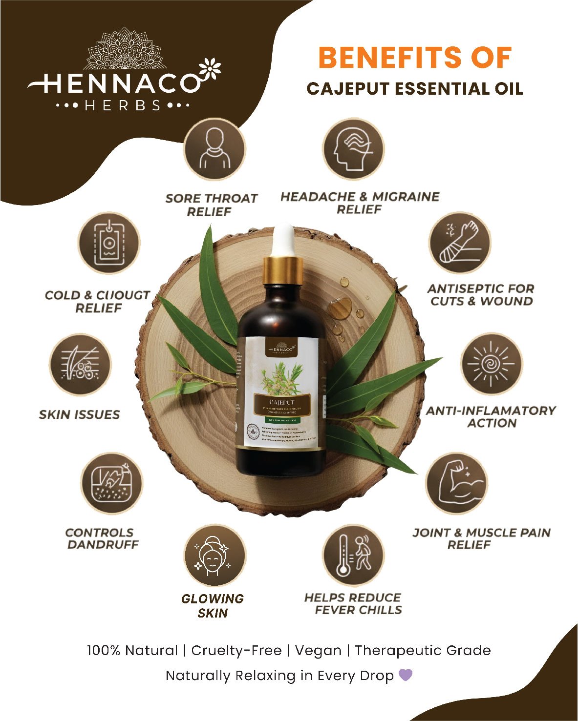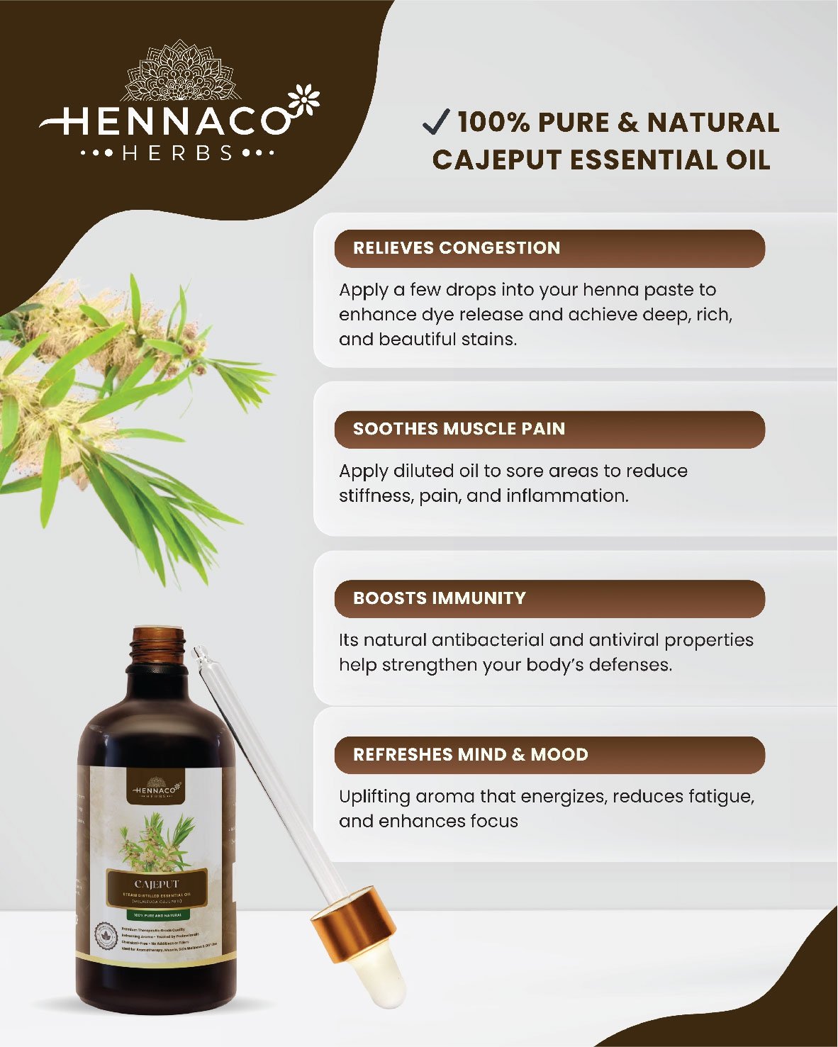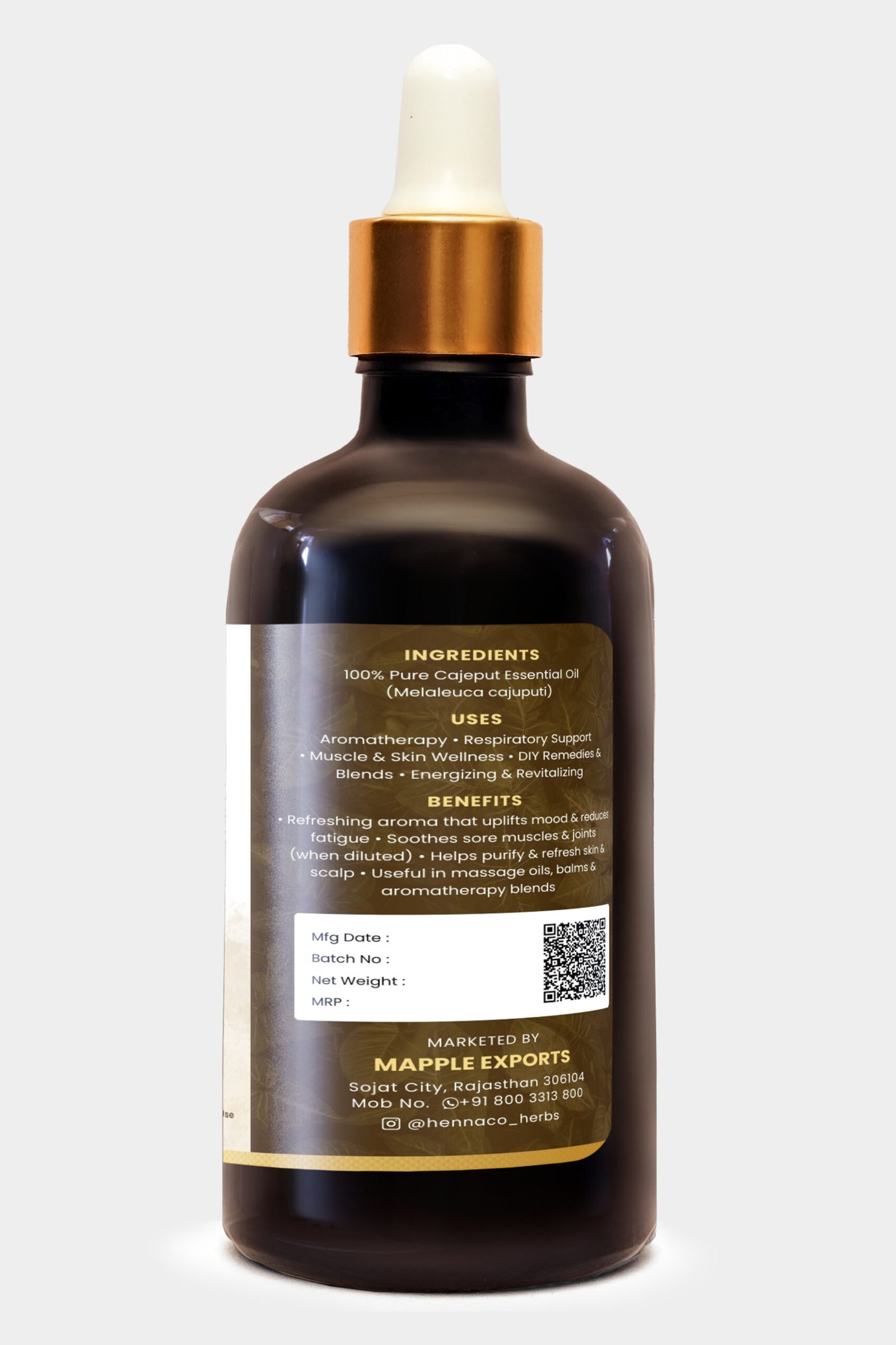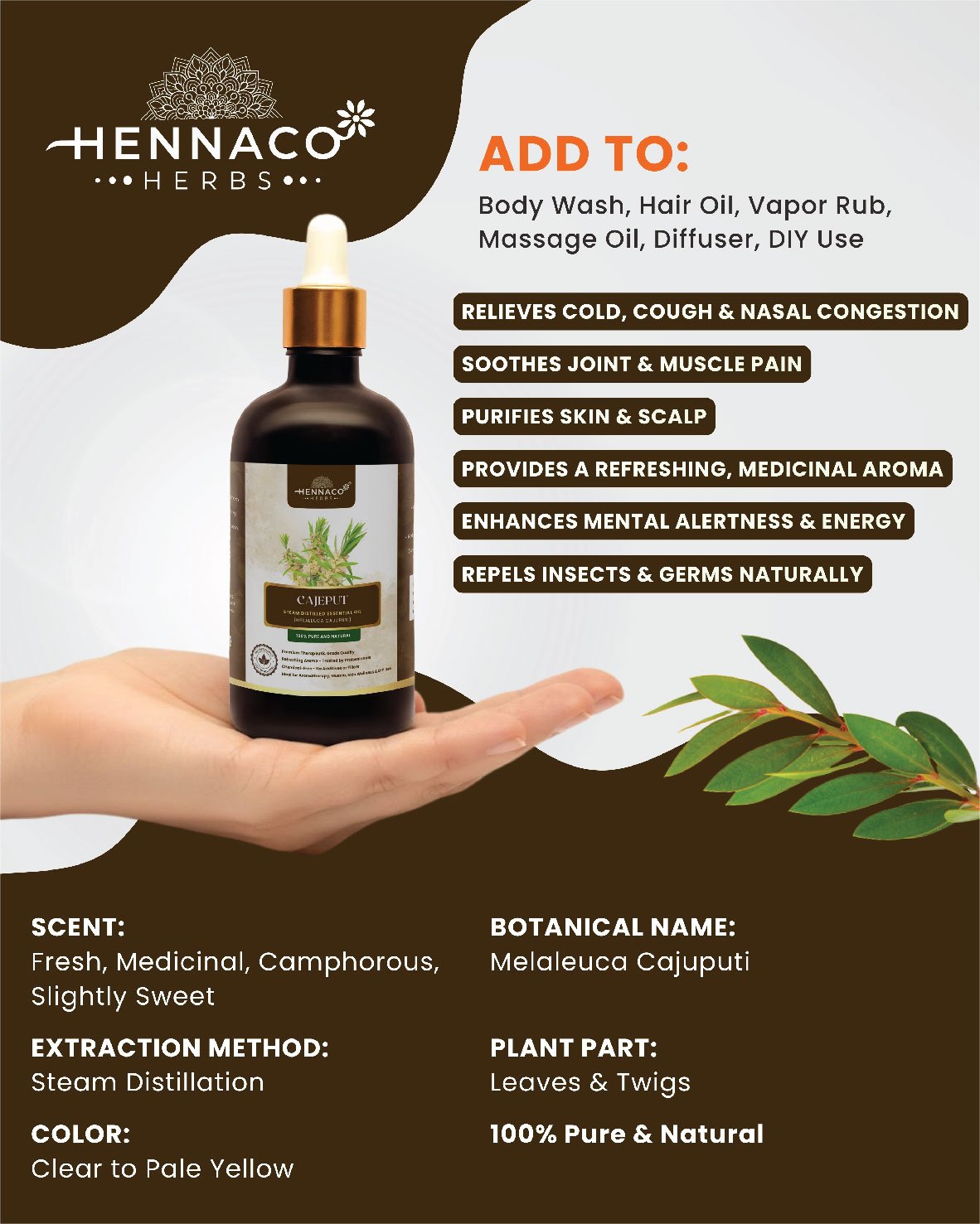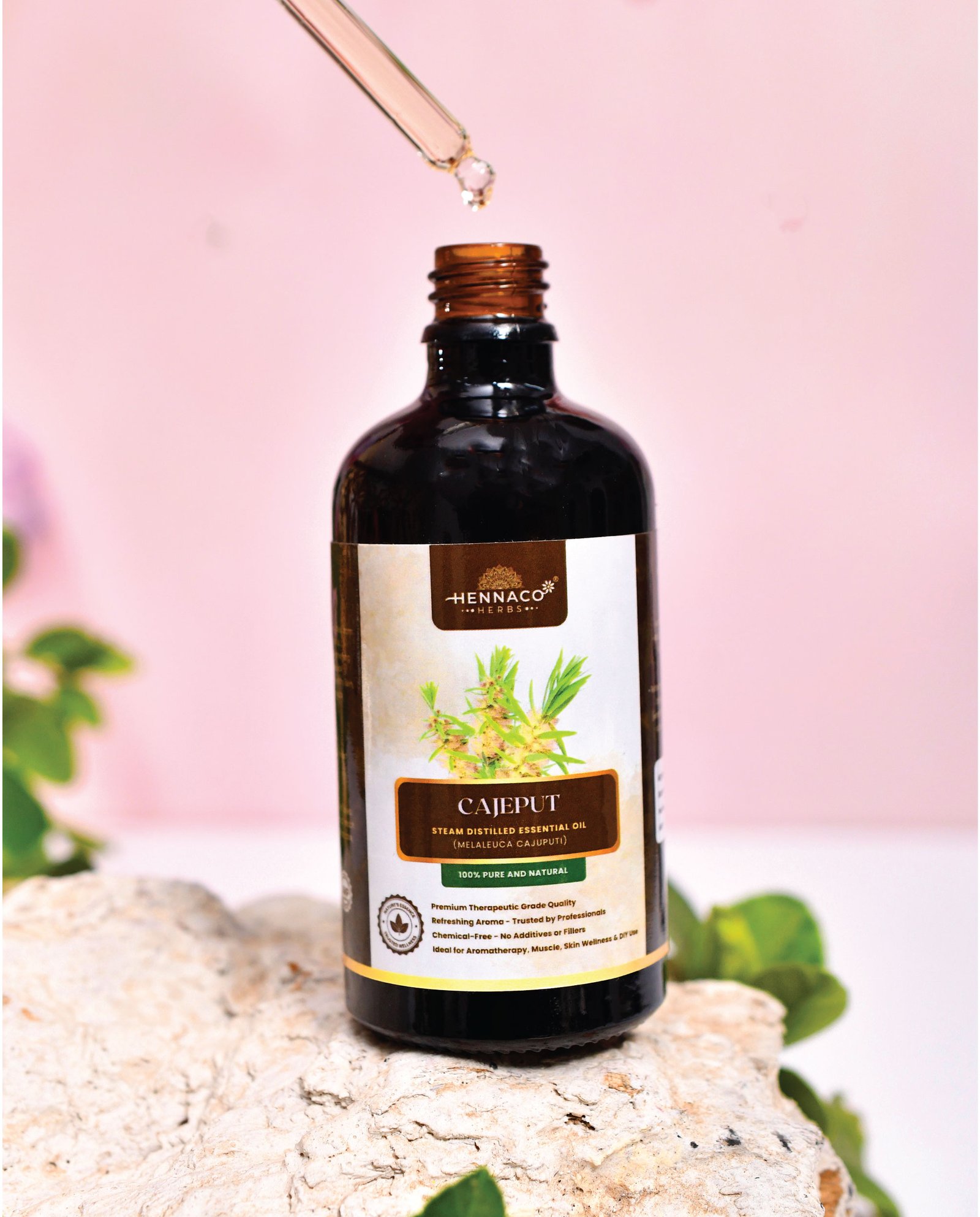 Hennaco Cajeput Essential Oil is 100% pure, natural & steam distilled. Perfect for aromatherapy, skin care, and overall wellness.