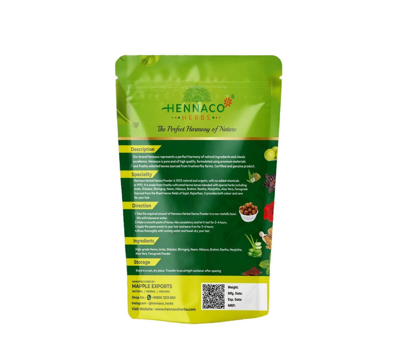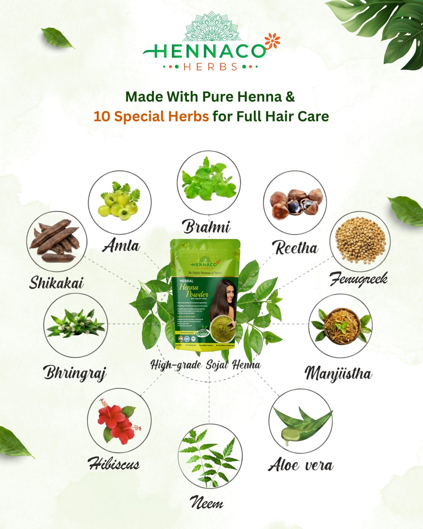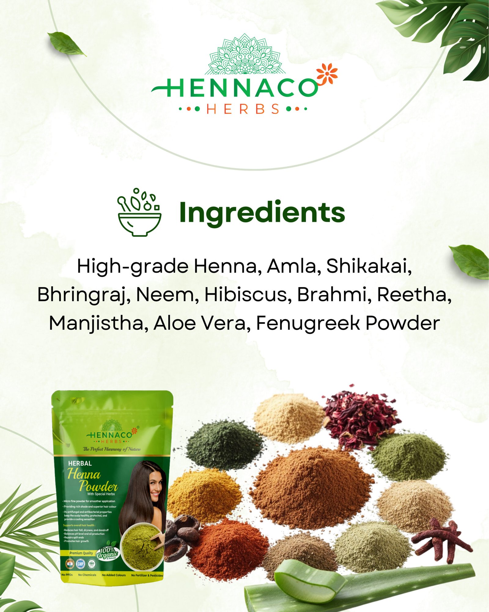 100% NATURAL AND PURE – High Grade Herbal Henna Blended with nature’s best: Amla, Shikakai, Bhringraj, Neem, Hibiscus, Brahmi, Reetha, Manjistha, Aloe Vera & Fenugreek Powder — for healthy, shiny, naturally colored hair. 💚✨